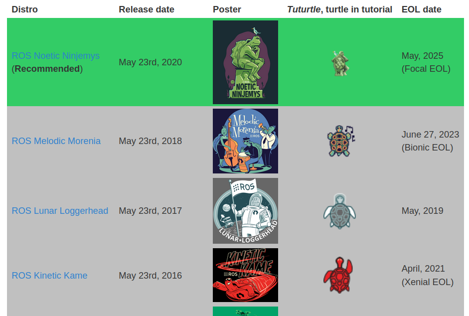 然后是ROS具体的版本选择,ROS1主要被Linux系统主持,有很多版本,参考http://wiki.ros.org/Distributions,从接触的用户而言,从Kinetic到Noetic的用户较多,我们比较推荐Melodic及之后的版本。不同的版本会有生命周期的考虑,比如Melodic 23年后官方不支持了,但不会影响使用,只是它的库更新不会活跃了。