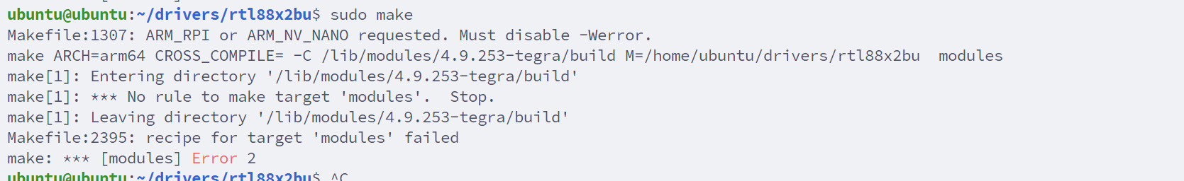 您好,目前的wifi模块rtl88x2cu是不支持802.11k和802.11v这种wifi漫游协议的,我想https://forums.developer.nvidia.com/t/wifi-adapter-tplink-ac1300/243480利用这个更新驱动,使得其可以在mesh组网环境下进行节点的切换,但是进行编译的时候报错发现module的4.9.253-tegra核心有两个虚空软链接,无法处理,