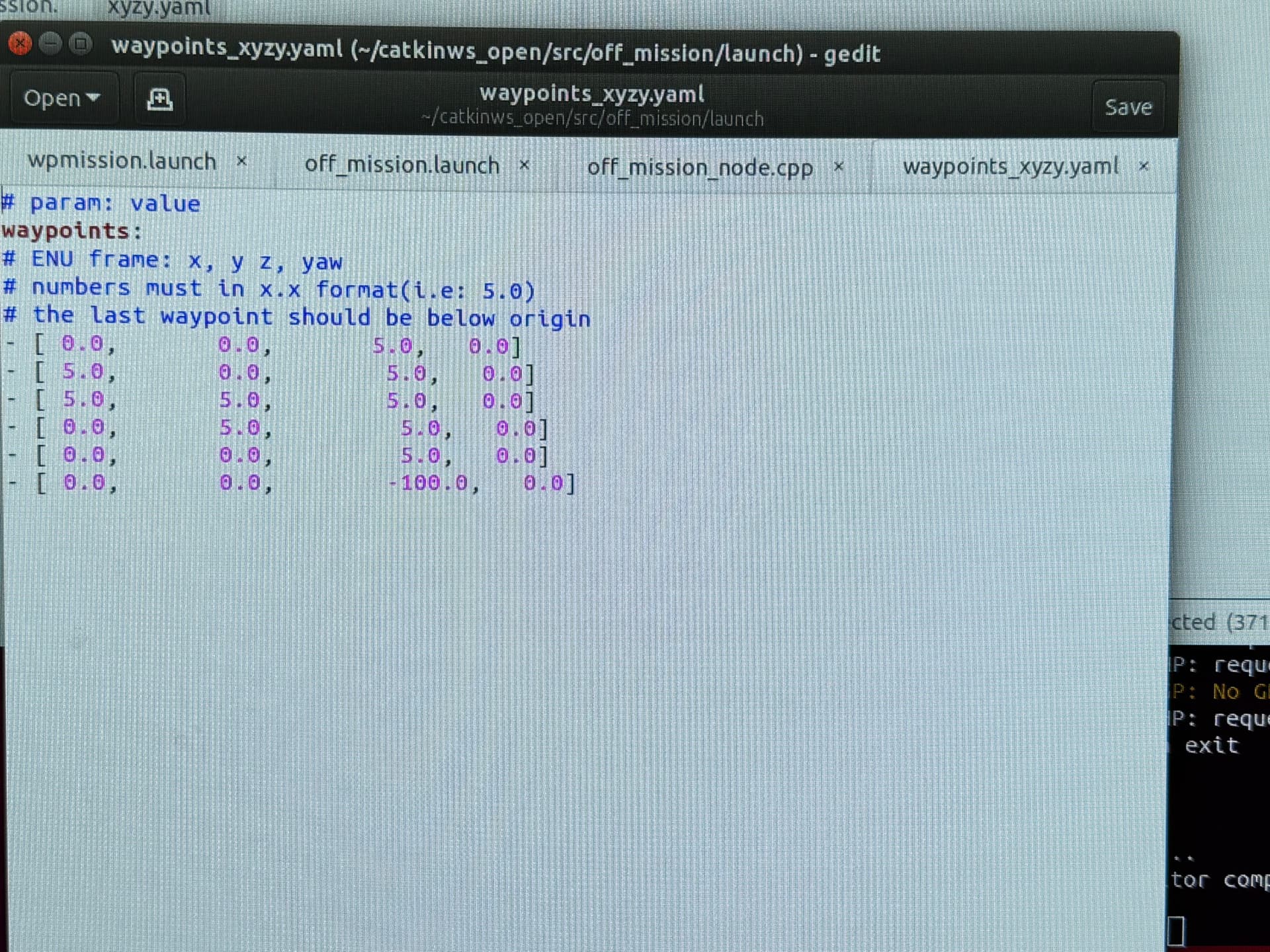 这个数值代表的是ENU坐标系下x,y,z和偏航角的值,最后一个点是降落点,为了方便就给设置成-100,使飞机可以一直向下飞降落和锁定