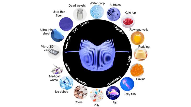 北卡罗来纳州立大学的研究人员开发了一种机器人抓取装置,它足够温和,可以拾取一滴水,足够强大,可以拾起6.4公斤(14.1磅)的重量,足够灵巧,可以折叠一块布,并且足够精确,可以拾取比人类头发细20倍的缩微胶卷。